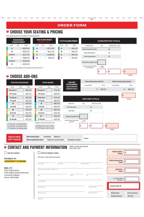 Call (207) 581-ARTS(2787) to place your order with a Box Office representative.